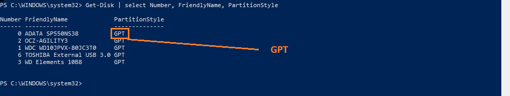 Jestli je GPT nebo né, najdes ve spravci disku, pomoci Diskpartu, nebo prikazem PShellu :