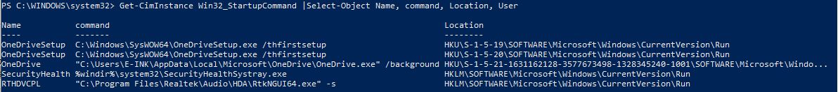 "Po spusteni" : si muze podrobne (i poloha reg. klice) vypsat pres "Get-CimInstance Win32_StartupCommand" (gcim Win32_StartupCommand |Select-Object Name, Command, Location, User), nebo programu AutoRuns od MS..