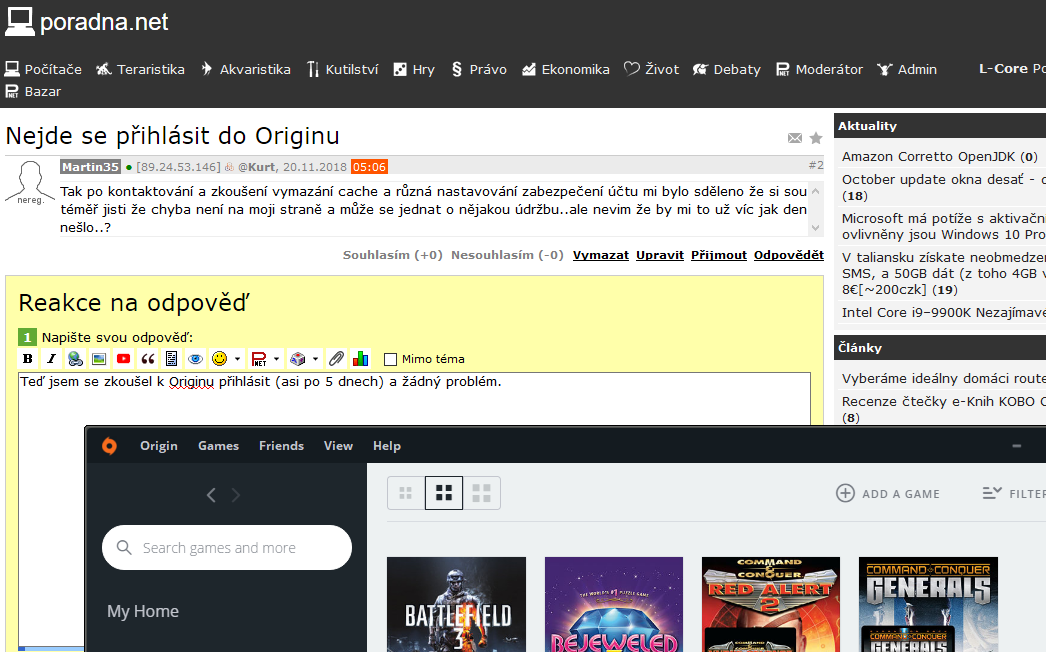 Přidat otázku mezi oblíbenéZasílat nové odpovědi e-mailem Nejde se přihlásit do Originu