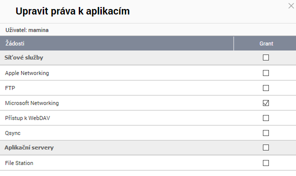 Kromě přístupu ke sdíleným složkám se nastavují i práva k aplikacím, ponechal jsem (zatím?) jen Windows sítě: