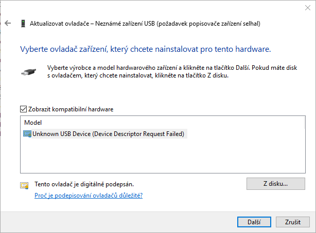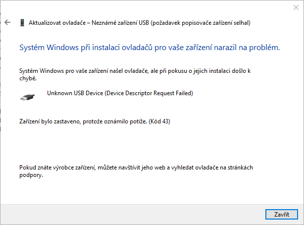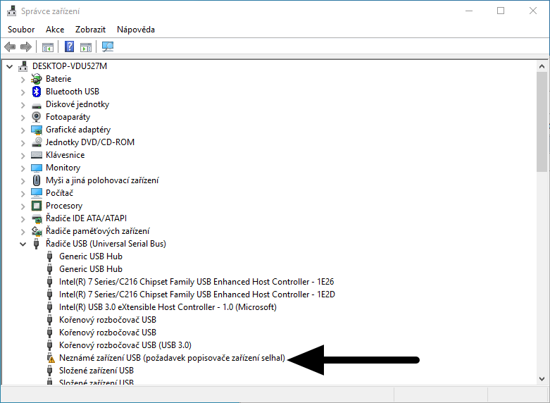 Ve správci zařízení to zobrazuje "Neznámé zařízení USB" - obrázek 2.