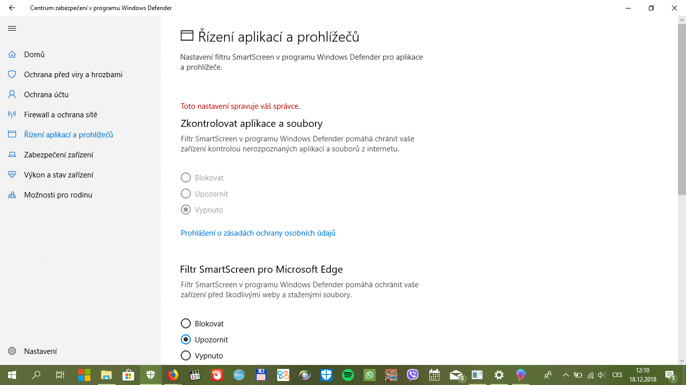 Omlouvám se, že opět píšu. Ale tentokrát připojím fotky. Mám takový dotaz. Nedávno jsem zjistil, že když přejdu do Centrum zabezpečení v programu windows defender a kliknu na ochrana před viry a hrozbami, objeví se upozornění, že - Váš správce IT omezil přístup k některým oblastem této aplikace a položka, ke které jste se pokusili získat přístup, není k dispozici. O další informace požádejte IT technickou podporu. Přitom mám normální klasický domácí pc, Windows 10. Dříve jsem si mohl dělat kontroly běžně sám, teď mi to píše tohle. V případě, že odkliknu ok, jako že chápu a znova kliknu na ochranu před viry a hrozbami, ukáže se mi - ochranu před viry a hrozbami spravuje vaše organizace. Nějak nechápu, proč mi to píše a proč nemůžu provádět v defenderu rychlou kontrolu. V oddělení řízení aplikací a prohlížečů - zkontrolovat aplikace a soubory, mi to zase píše - toto nastavení spravuje váš správce. Žádné velké změny jsem v pc nedělal a vše funguje. Jen mě zaráží tyto věci, které tam dříve nebyly napsány. Asi před půl rokem jsem dělal přeinstalaci windows 10. I pak bylo vše ok a kontroly jsem mohl dělat sám. Ale před několika týdny jsem zjistil toto. Navíc mi každý den vyskočí upozornění na antivirovou ochranu, po rozkliknutí se otevře možnost antivirové ochrany defender, ale je vypnutá a nejde zapnout. Nicméně pc pracuje zdá se normálně. Může mi někdo poradit co s tím, nebo jestli je to normální?