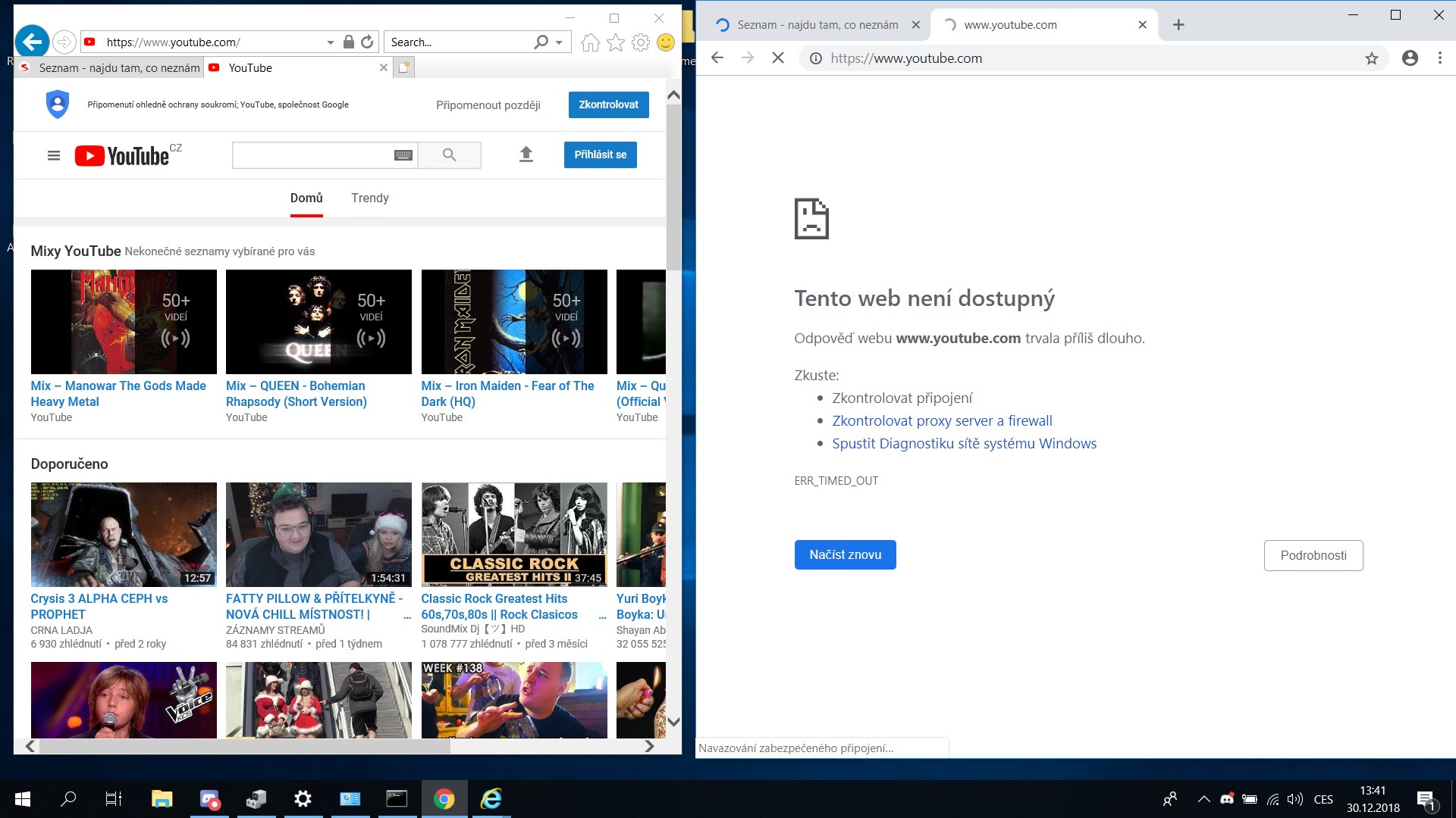 Cokoliv zobrazím v IE se načte, doslova instantně, avšak když použijí jiný prohlížeč (chrome, Opera, Microsoft edge) stránky se většině případu nezobrazí (Tento web není dostupný) nebo příliš dlouho načítají viz. příloha (Youtube -> IE = zobrazí/chrome = Tento web není dostupný | Seznam -> IE= zobrazí/chrome=stále načítá) .