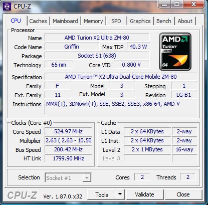 z ničeho nic se mi zpomalil notebook. Ve správci úloh jsem si všiml, že využití CPU jede cca od 85-100%. Podivné bylo, že součet spuštěných procesů neodpovídá aktuálnímu využití CPU – vždy byl součet spuštěných procesů menší, než aktuální využití CPU. Myslel jsem si, že jsem „ulovil“ nějaký vir, proto jsem si nechal prohlédnout log z RSIT na forum.viry. Měl jsem tam nějaký drobný malware. Po jeho smazání problém stále přetrvává. Proto jsem začal mít podezření na odcházející HDD, ale HD Tune mi ukázalo, že je vše ok. Proto jsem stáhl prográmek CPU-Z a zjistil jsem, že rychlost procesoru je cca 525Hz – viz příloha. Procesor mám AMD Turion X2 Ultra MZ-80 2,1GHz.