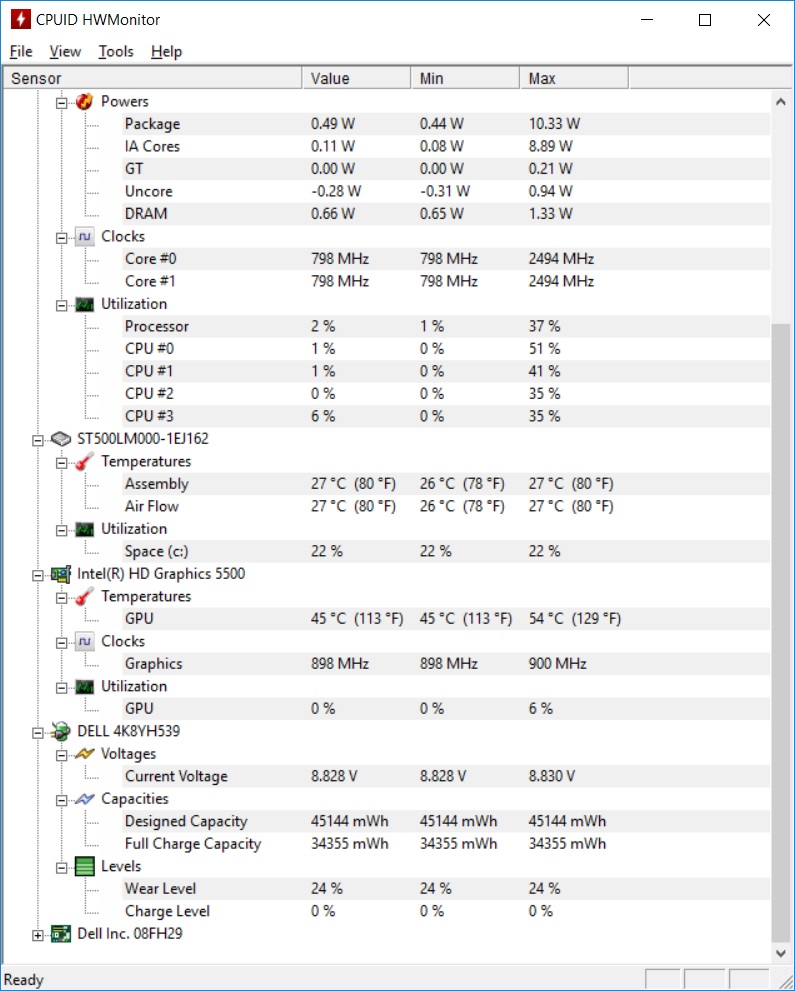 1) Na kapacitu baterie, nahlednem redeji pres "Software" pouzit muzes [HWMonitor] :https://www.cpuid.com/downloads/hwmonitor/hwmonitor_1.38.exe