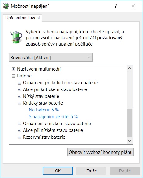 - Ted potrebuj, aby jsi sel do nastaveni "Správce napájení" a nahled na nastaveni baterie na kolik % mas nastavené kriticke.