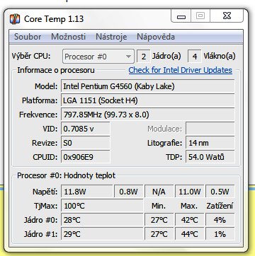 | Používám Core Temp 1.13. Teploty jader, frekvenci a jiné možno sledovat průběžně na hlavním panelu.… wakar 24.01.2019 07:02 |