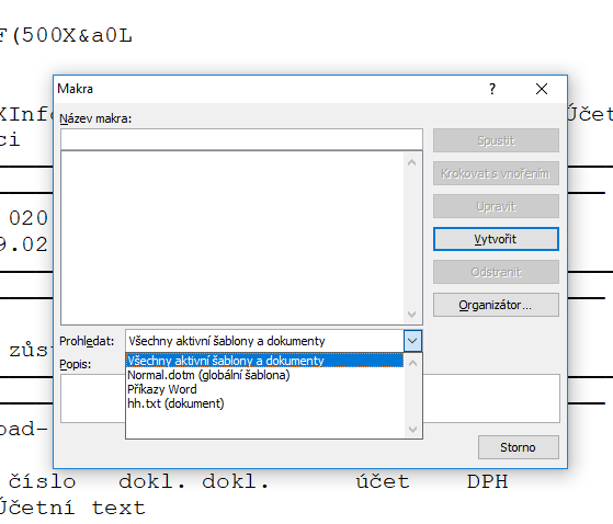 Na tom obrázku výše: nedokážu donutit Word, aby ve "Všechny aktivní dokumenty a šablony" zobrazil ten otevřený docm s makrem, které by pak mohlo být použitelné pro dlaší soubory. A nefunguje to ani v případě, že makra ve Wordu povolím úplně všude.