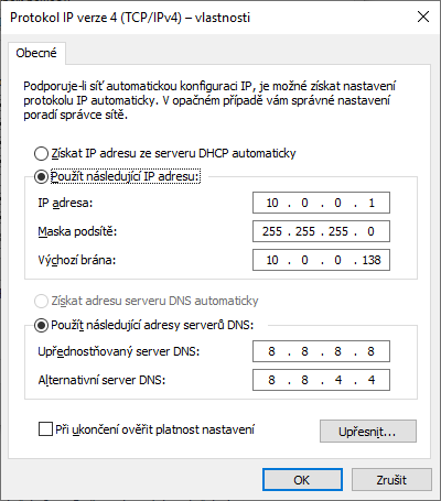Myslel jsem to takto, když zadám do příkazového řádku ipvconfig tak bych chtěl mít statickou ipv4 10.0.0.1, aby mi ji nepřiřazoval router, což bych mohl nastavit ve windows, ale já bych tě chtěl poprosit jak to nastavit v routeru a tento obrázek co jsem dal do dotazu tak je to tak nastavené automaticky. Vím jenom že jsi doporučoval DNS Google 8.8.8.8 a 8.8.4.4. Jak to mám zadat v routeru aby to fungovalo? Ve windows to mám takto. Děkuji