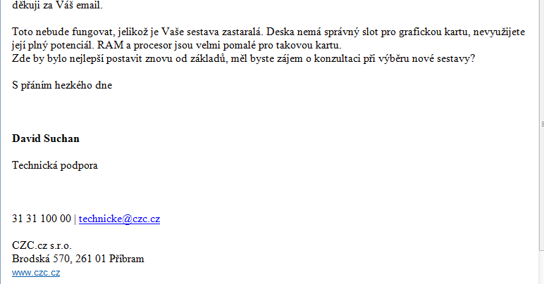 Jako to jsem si taky trochu říkal, že se snaží.. ale zarazila mě ta jeho jasnost ohledně nekompatibility GPU s mojí základní deskou, tak nevím.