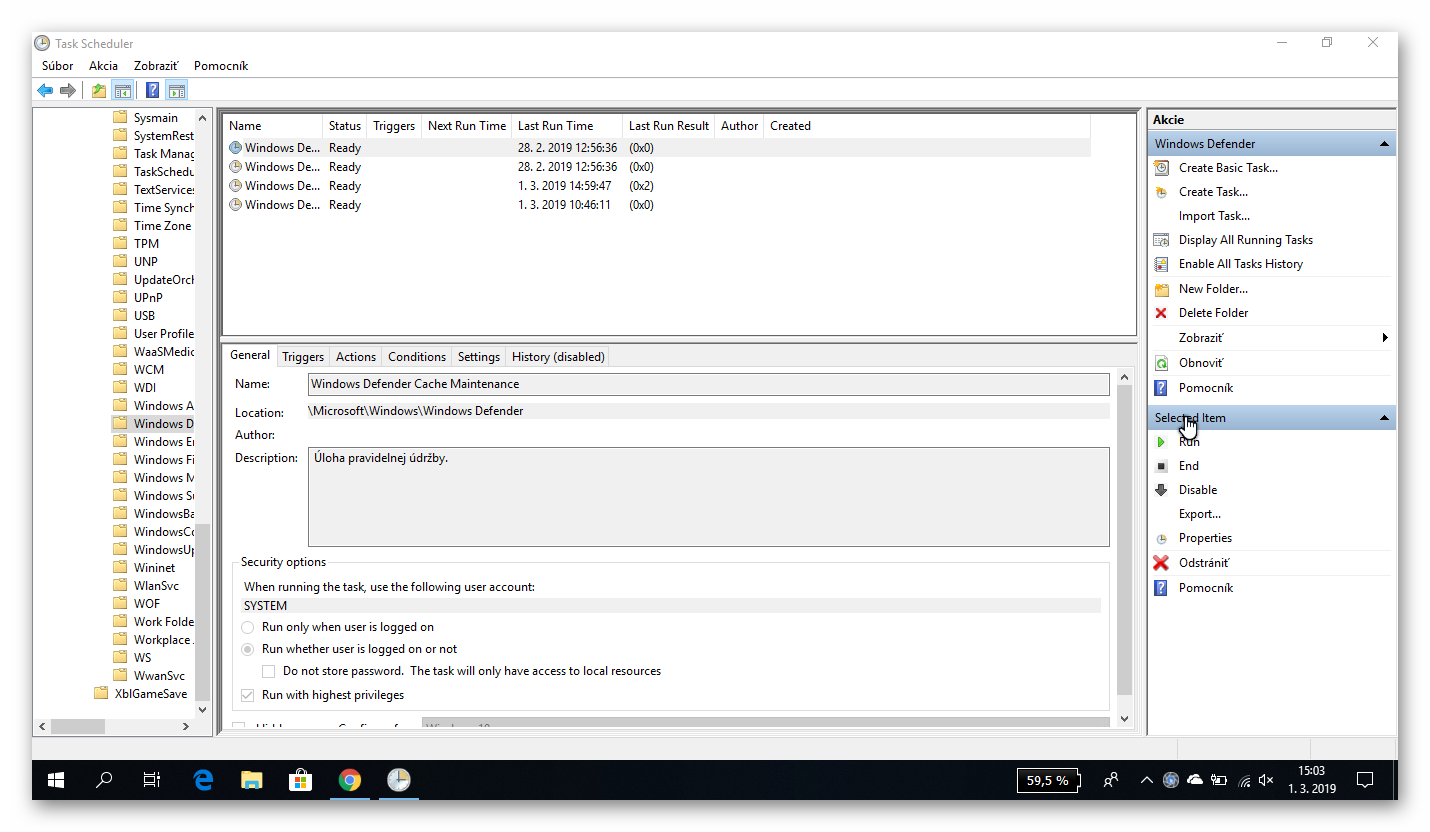Dobrý,chcel by som sa opýtať,dá sa vo windows defender nastaviť,aby mi dnes napr.o 20 00 vykonal automaticky uplnú kontrolu mojho notebooku?Že vraj sa to nastavuje vo Plánovači úloh-Event Viewer.Len neviem ako a kde,kedže to tam je skoro všetko po anglicky.Sory už viackrát som tu omielal defender.Notebook s W 10 home používam denne.A príklad že ak by sa dalo nastaviť že by mi každý piatok večer,sa zapol automaticky WD uplná kontrola.Ja viem ruky by mi neodpadli,keby som klikol na ikonu Defenderu a tam to spustil.Ono ak sa nemýlim Defender sám automaticky kontroluje pc,notebooku,ale to je len rýchla kontrola.Pekný deň