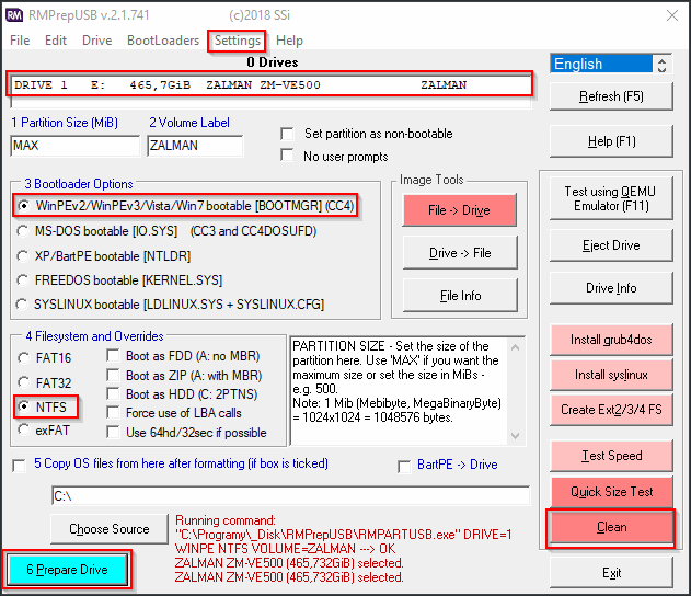 3. zvolte WinPE, zvolte NTFS a klikněte Prepare drive. Počkejte než program skončí