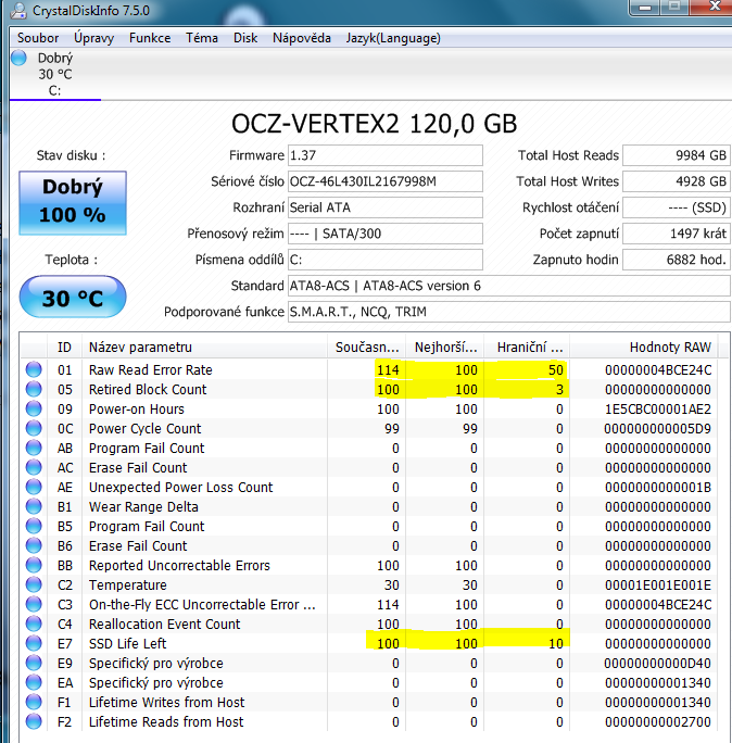 Potřeboval bych se v tom orientovat co tam (které řádky a které hodnoty) sledovat? Dočetl jsem se, že nejdůležitější je sloupec RAW u řádku 05, ale u přemapovaných sektorů je nula. Takže by to mělo být OK. S tím pak souvisí otázka, co jsou hodnoty ve sloupcích současné, nejhorší a hraniční hodnoty. To taky nevím.