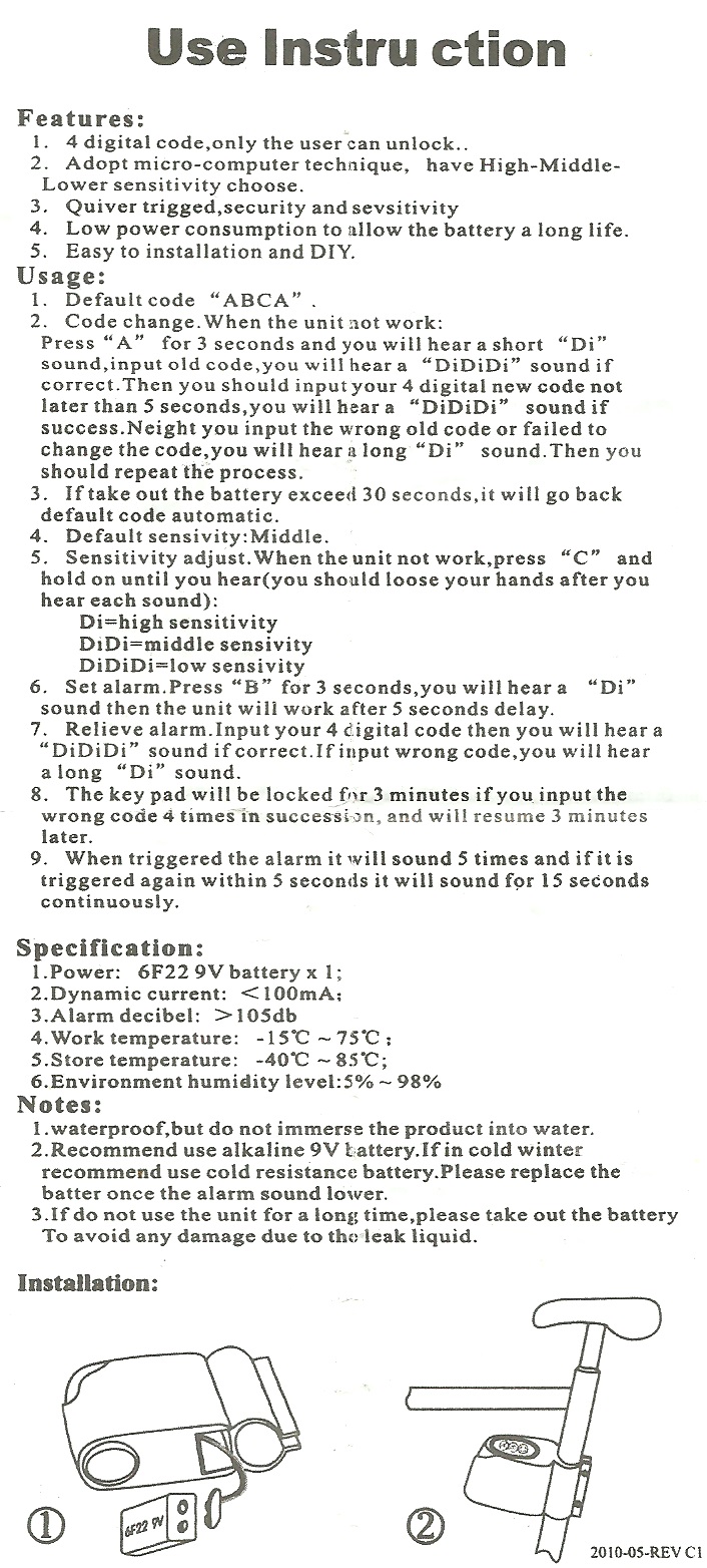 I. Vodotesný, ale výrobok neponárajte do vody 2. Odporúčame použiť alkalickú 9 V batériu Ak je v zime, odporúčame použiť batériu s odporom za studena.