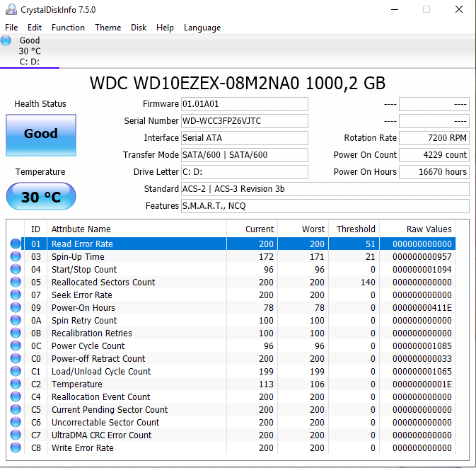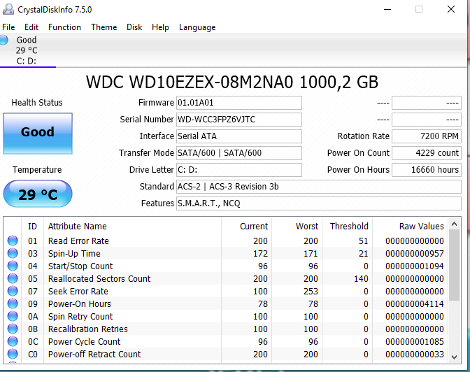 wd10ezex je 7.200ot disk. je v režimu sata3. smart hodnoty (id 05,c5,c6,c7) jsou 0=ok, disk by měl b… nový