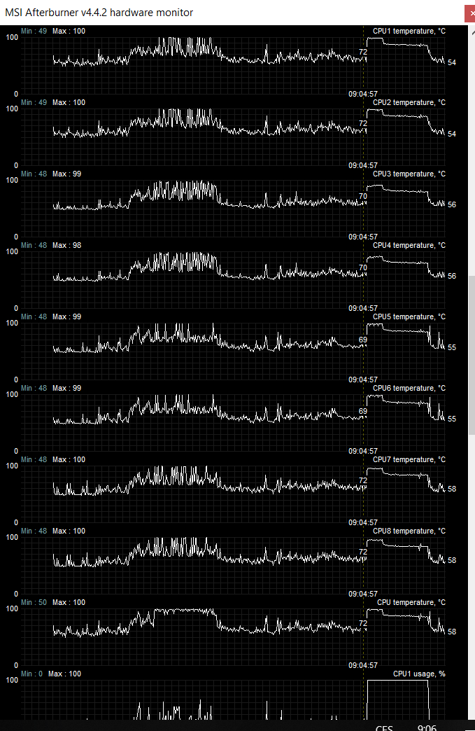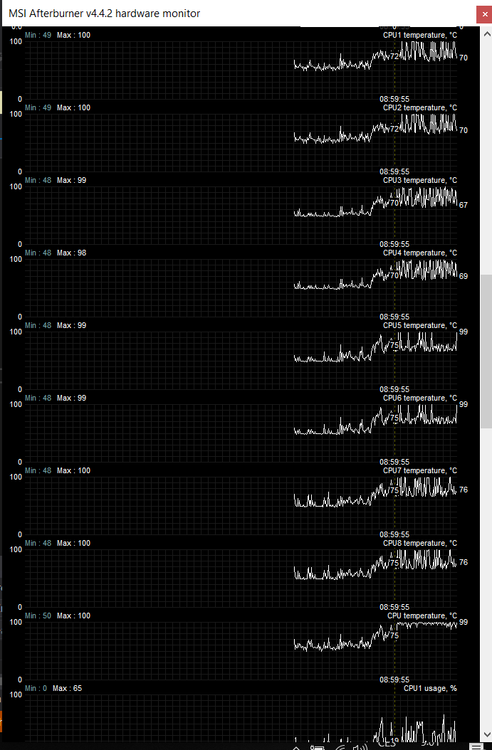 Z 99% ho používám na práci, kdy se teploty CPU pohybují kolem 50 - 65°C. Problém nastává když na chvíli zapnu klidně i 15 let starou hru. Třeba staré GTA Vice City, kdy mi MSI Afterburner ukazuje využití CPU kolem 10-30%, ale teplotně se pohybuju po celou dobu hraní mezi 90 až 100°C(u hry která běhávala bez problému na Pentiu 4).