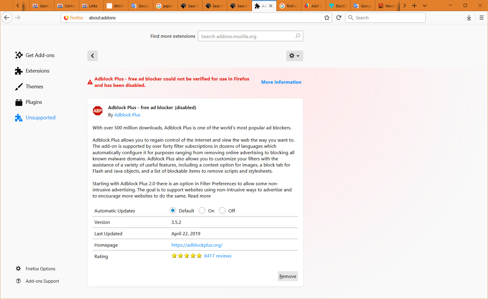 Ve správě add onů ve firefoxu je u všech add onů napsáno "Jméno ADD-onu - could not be verified for use in Firefox and has been disabled."