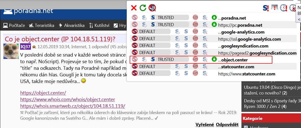 V poslední době se snad v každé webové stránce objevil nějaký obsah z object.center (identifikuje to např. NoScript). Projevuje se to tím, že pokud object.center nepovolím, nezobrazují se například "title" na odkazech. Tady na Poradně například mouseover nad "Souhlasím - Nesouhlasím", pokud je někomu dán hlas. Gouglí je k tomu taky docela skoupý na slovo. Ví o tom někdo něco? Vede to do USA, takže moje nedůvěra...