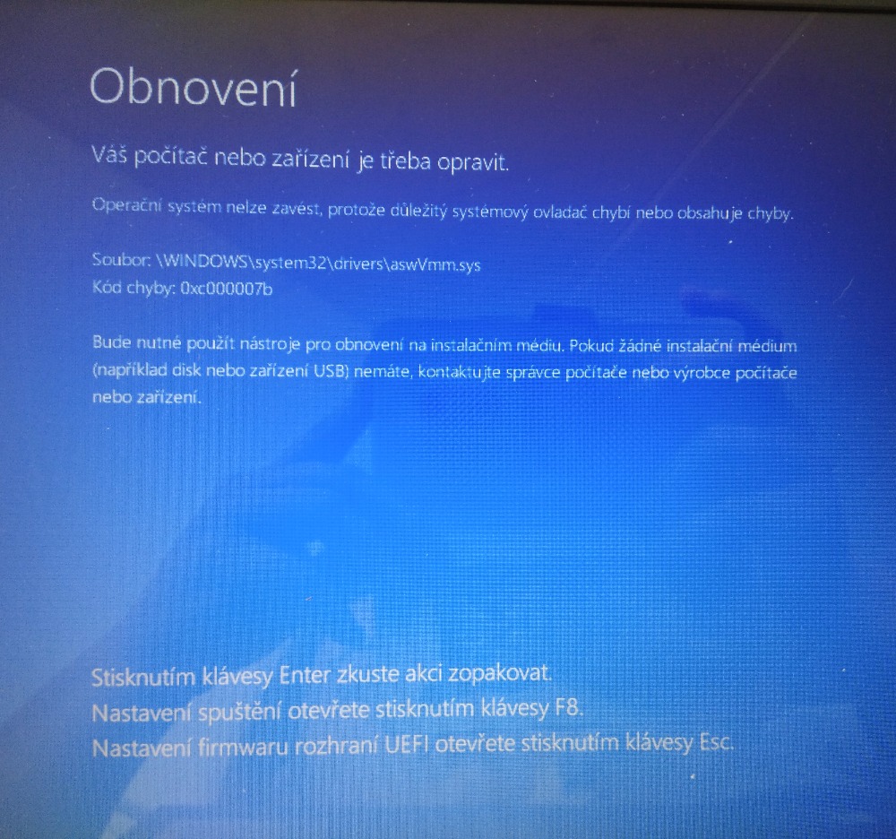 nebo 2) jestli byla updatována verze win, po stisknutí f8 pohledat, jestli se nabízí start do minulé verze. (a avast opět vykopat ven)