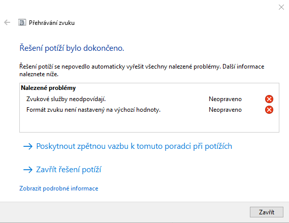 Edit. Zvuk fungoval asi 5 minut, než mi přestalo hrát video na Youtube se zprávou - "Chyba zvuku. Restartujte počítač." Po resetu zvuk opět nejde...