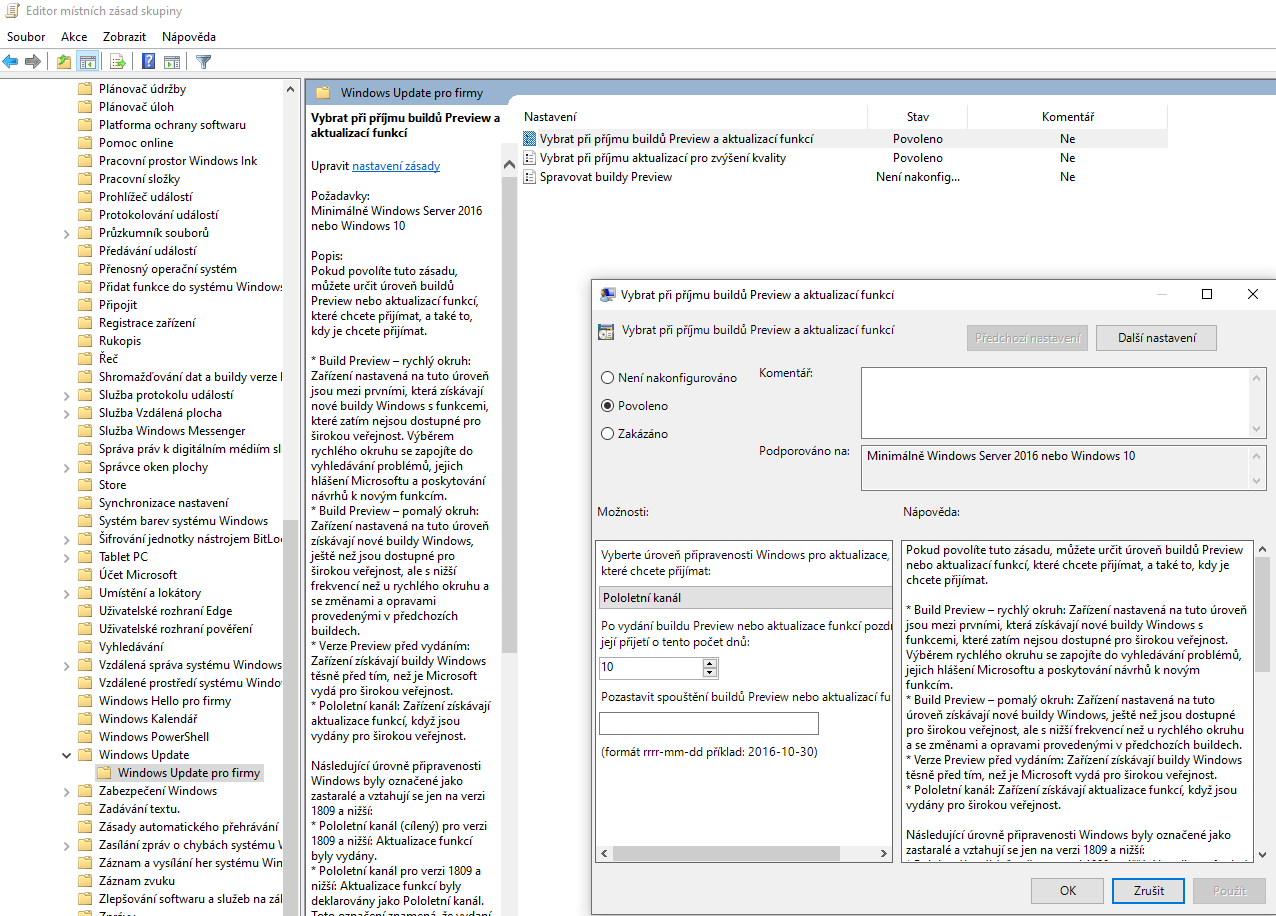 Jinak mistni zasady to uplne neresi, protoze pres ne muzu nastavit jen odklad vylepseni, ale pres to nastaveni, ktere bylo v minulych verzich Windows jsem mohl nastavit i odklad pro zabezpeceni.