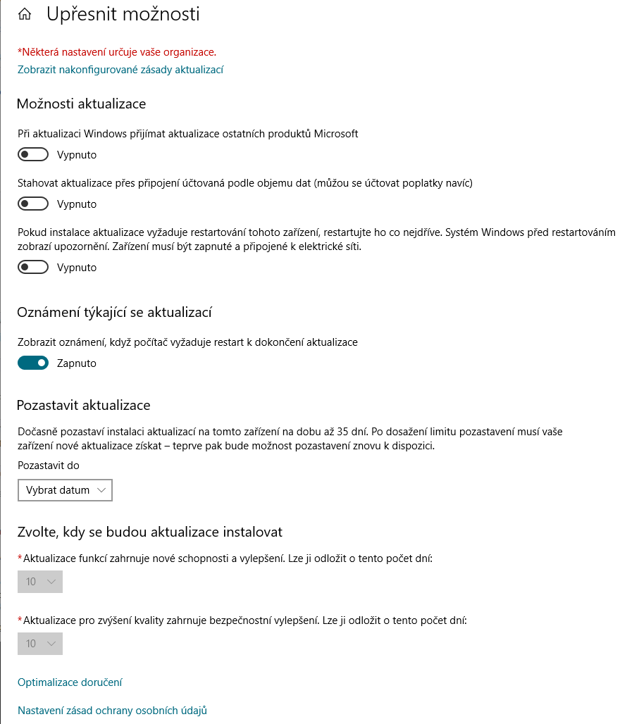 Nainstaloval se mi upgrade na 1903 mych Windows 10 Pro a zmizela mi moznost odlozit aktualizace.