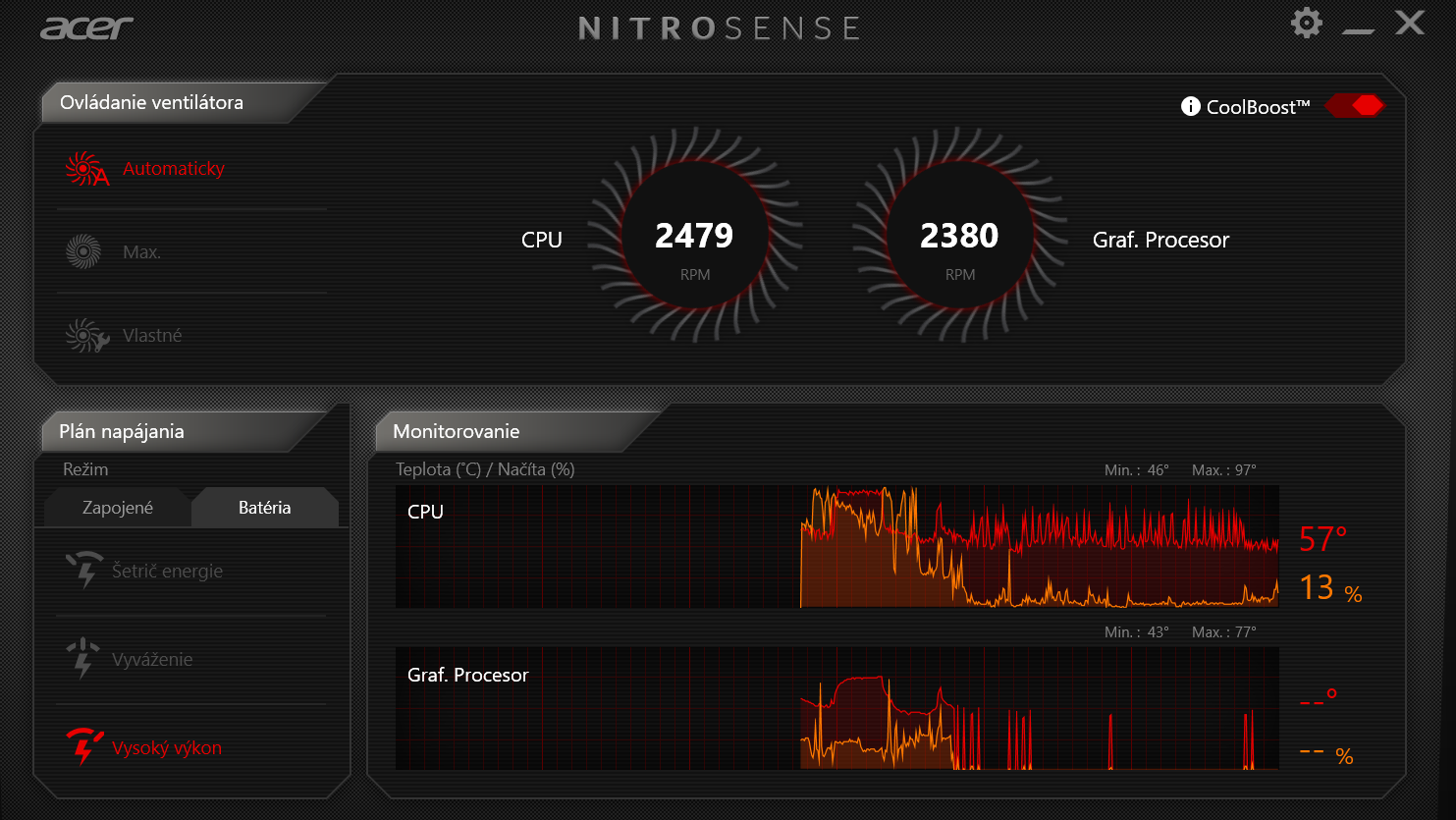 Zdravím jedná sa o notebook Nitro 5 čo môže spôsobovať tieto náhle skoky teplôt ako môžte vidieť na obrázku na začiatku to bolo v napájaní a pustená k tomu hra čiže pracovala grafiky aj cpu a keď bol notebook v elektrina tak sa to vyšplhalo na 97 stupnov cpu na dotyk pod obrazovkou to normálne pálilo neskutočne čiže som usúdil že to nebude v poriadku :D vypol som hru teplota cpu poklesla a ked som vytiahol aj s napájania tak uplne všetko do normálu akonáhle som zapol napájanie zase tak hneď to robilo 20 30 stupnové skoky . čiže problém je že to mám v kamíone ale mám normálny menič z 24 V na 230 V adaptér je normálne písaný input z 100 až 240 V takže nevidím tam ja problém ale očividne tam nejaký je viete mi povedať kde ? :/ ?