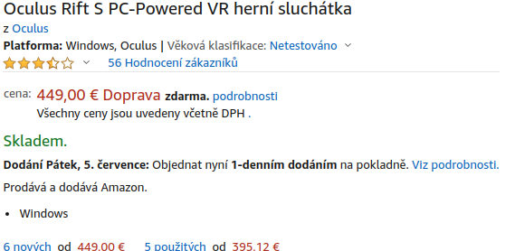 Chci si objednávat brýle pro virtuální realitu Oculus Rift S. Problém je, že se jedná o poměrně nový produkt, který Oculus nedováží do ČR a tuzemské obchody je nemají skladem a nejsou zatím schopni říci, kdy budou. Momentálně mám objednávku na Alze s cenou 12 800 Kč. Brýle jsem ale našel na německém Amazonu a jsou tam za 450 € s dopravou zdarma do ČR. Jsou tam levnější a hlavně skladem.