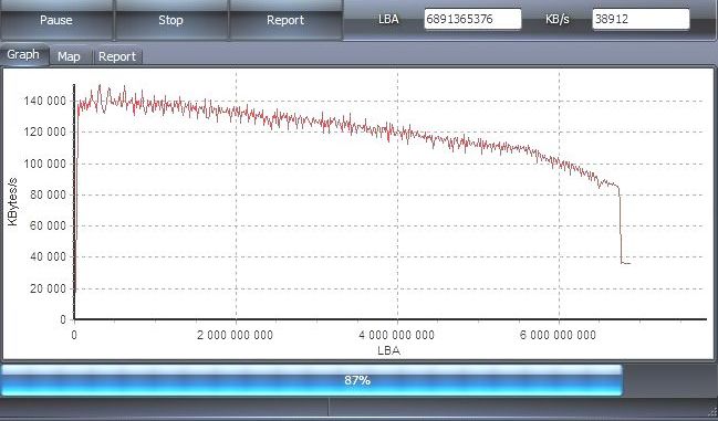 - Hdd jsem připojil do PC , aktivoval v GPT a úplně naformátoval (trvalo to 9h). Dal jsem kopírovat soubory (byly to soubory o velikosti 8Gb a více) , rychlost kopírování byla kolem 130Mb/s což bylo v pořádku, problém nastal asi po zkopírování 15Gb , kdy rychlost spadla na 1,5Mb/s. Otevřel jsem správce úloh a ukazovalo to využití hdd 100% a rychlost zápisu 1,5Mb/s. Kopírování jsem pozastavil, a stav ve správci úloh byl stejný, teprve až po 3 minutách vytížení hdd spadlo na 0%, dal jsem tedy pokračovat v kopírování, a rychlost opět 130Mb/s, jenže po zkopírováni pár Gb nastal stejný problém. Byly to první data které se na hdd kopírovala, nechápu tedy co hdd ty 3 minuty dělal. Tak jsem zapnul program HDDScan v3.3 a udělal test , bohužel asi po 85% spadla neuvěřitelně rychlost (viz. obr). Tohle se mi stalo u dvou HDD, proto by mě zajímalo zda je to normální nebo jsem natrefil na dva špatné kusy.