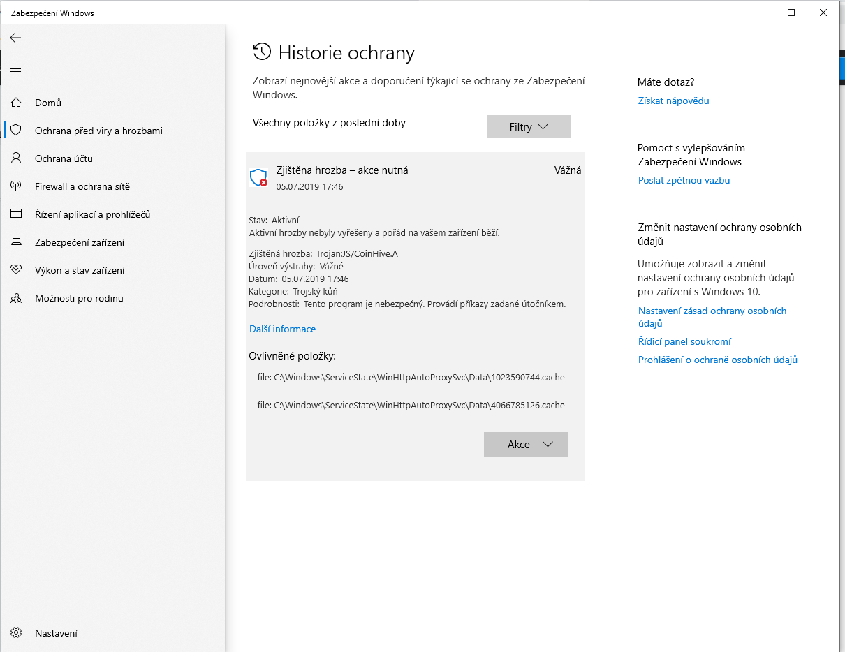 Zjištěná hrozba: Trojan:JS/CoinHive.A