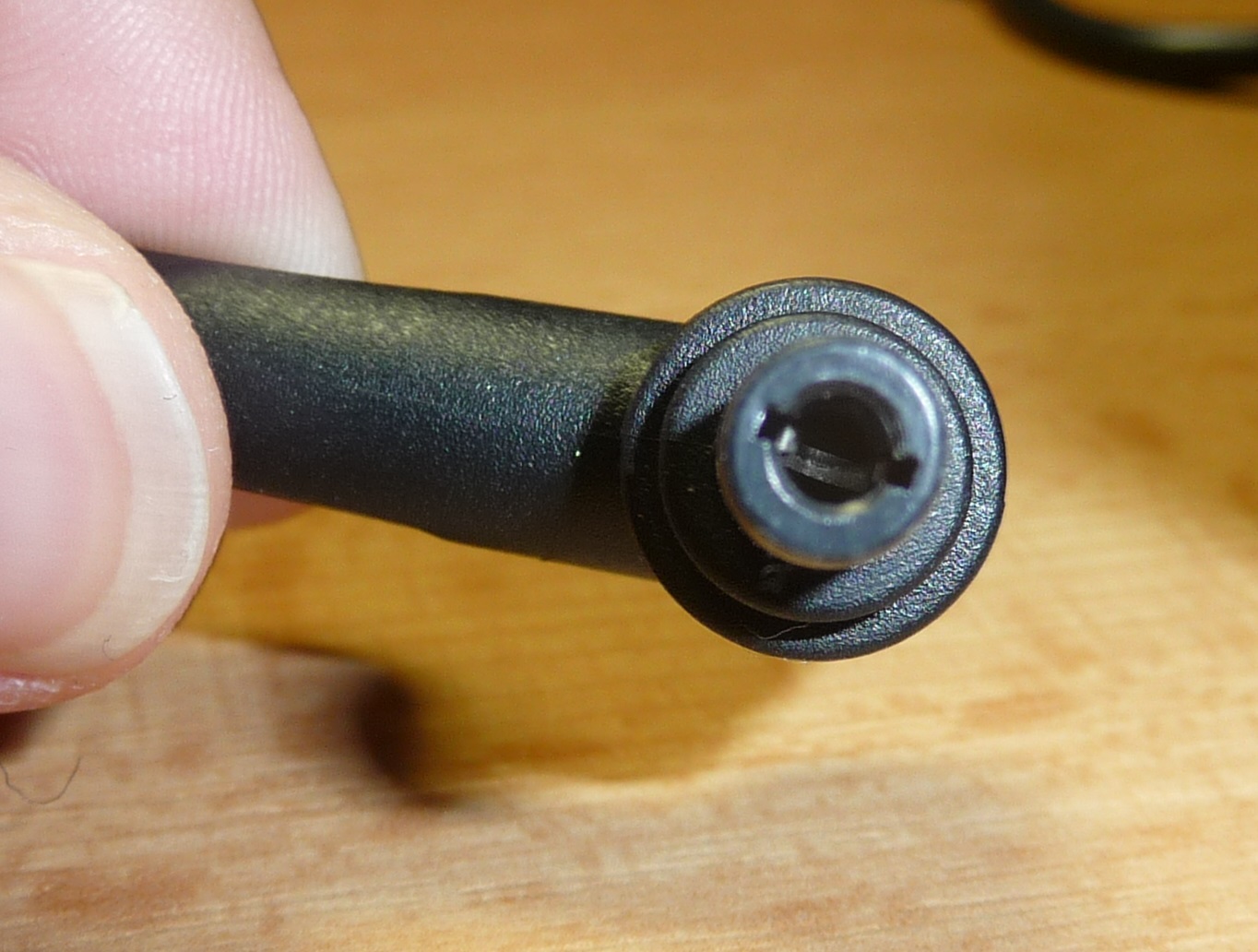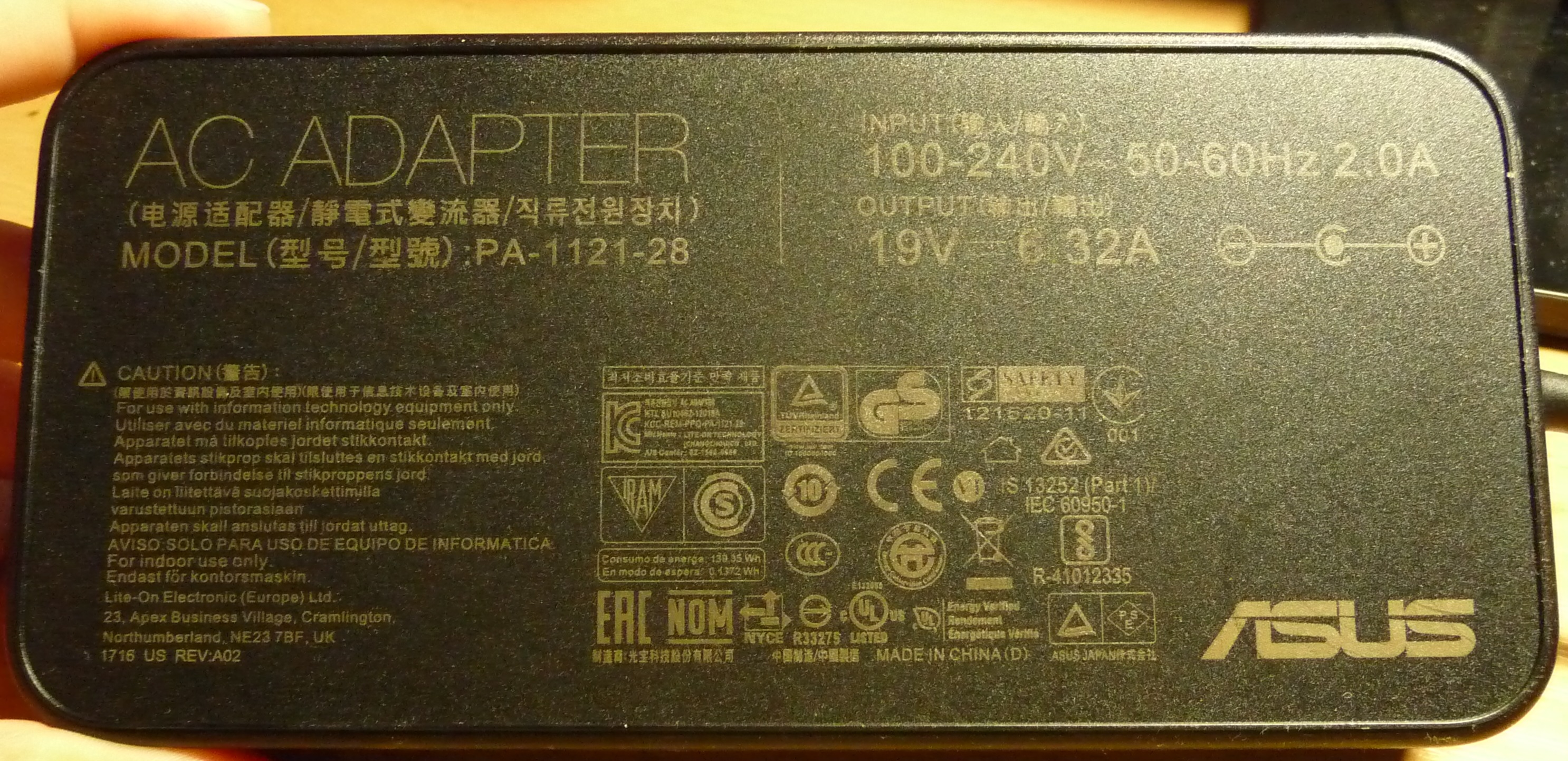 Značka je Asus. Kdyby bylo omezení proudu např. těch 5A, při 19V (napětí originální nabíječky), to by znamenalo výstup 95W. To by podle mě na nabíjení notebooku (bez jiné zátěže) mělo stačit. Když jsem kdysi nabíjel notebook, který byl nabitý asi z 50%, měřič spotřeby ukazoval 30W. Volnější kontakt tam není. To jsem testoval. Přikládám fotky konektoru a nabíječky.
