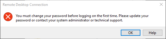 Takže buď povedz tomu, kto ti dal prístup, že sa ti tam zobrazila táto chyba, alebo môžeš vyskúšať zložitejší postup pre zmenu hesla, ktorý je popísaný napríklad tu: Forced password change at next logon and RDP