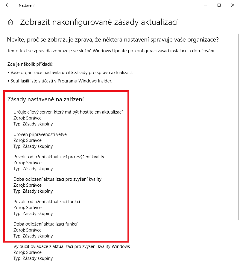 Hned pod tou červenou hláškou o nastavení organizací je link, kde je seznam nastavení. Tam se dá zjistit, co je kde změněno, viz příloha. Červeně je výsledek nastavení odložení aktualizací v gpedit.msc, pod tím zákaz aktualizace driverů, nastavený přes Tento počítač - Vlastnosti - Upřesnit nastavení systému - Hardware - Nastavení instalace zařízení - Ne.
