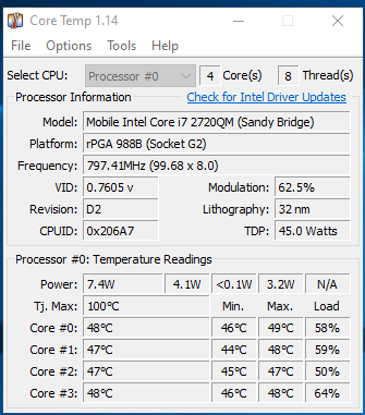 Problém je, že procesor dle HWINFO, CORE tempu a OCCT (při zátěžovém testu na procesor) jede pouze na 800 MHz.