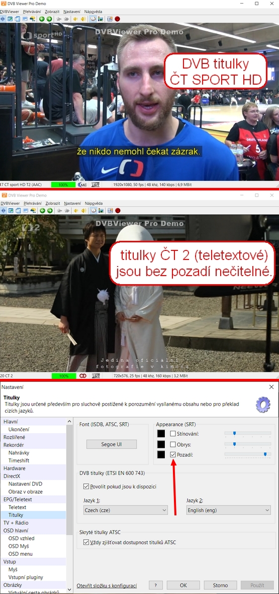 Ne, ne, ne, teletextové titulky sa nastavujú zvlášť na karte Teletext, pohraj sa s volbou "Background" a "Outline" a budeš mať titulky napr. takto. Alebo takto (Outline=1, Background=80%). DVBViewer je sice platený ale zas tak vela nestojí.