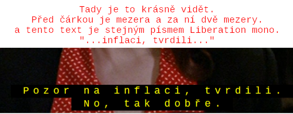 Tam byl Courier, nedalo se to vůbec číst. Takto to vypadá s Liberation mono (používá se v televizích a set top boxech). Ono je celkem jedno, co tam je za font, jelikož to dělá mezery u jakéhokoli fontu.