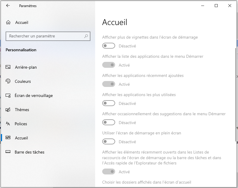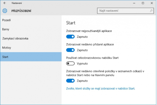 V nabídce "Přizpůsobení | Start" klikněte na volbu → "Zvolte, které složky se mají zobrazovat v nabídce Start" a dostanete se k seznamu složek, jejichž zástupce lze v nabídce Start aktivovat.