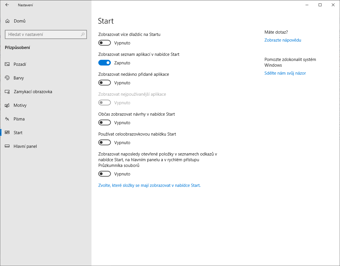 V nabídce "Přizpůsobení | Start" klikněte na volbu → "Zvolte, které složky se mají zobrazovat v nabídce Start" a dostanete se k seznamu složek, jejichž zástupce lze v nabídce Start aktivovat.