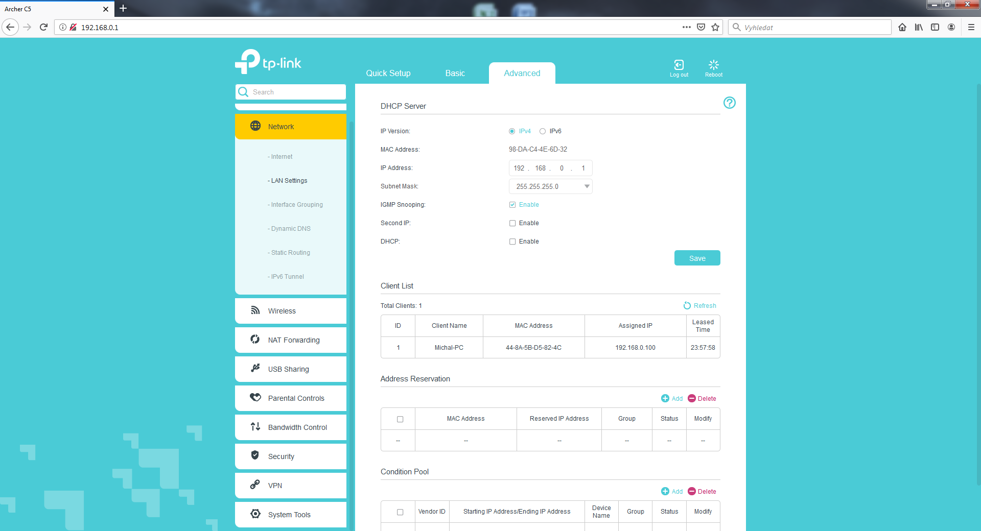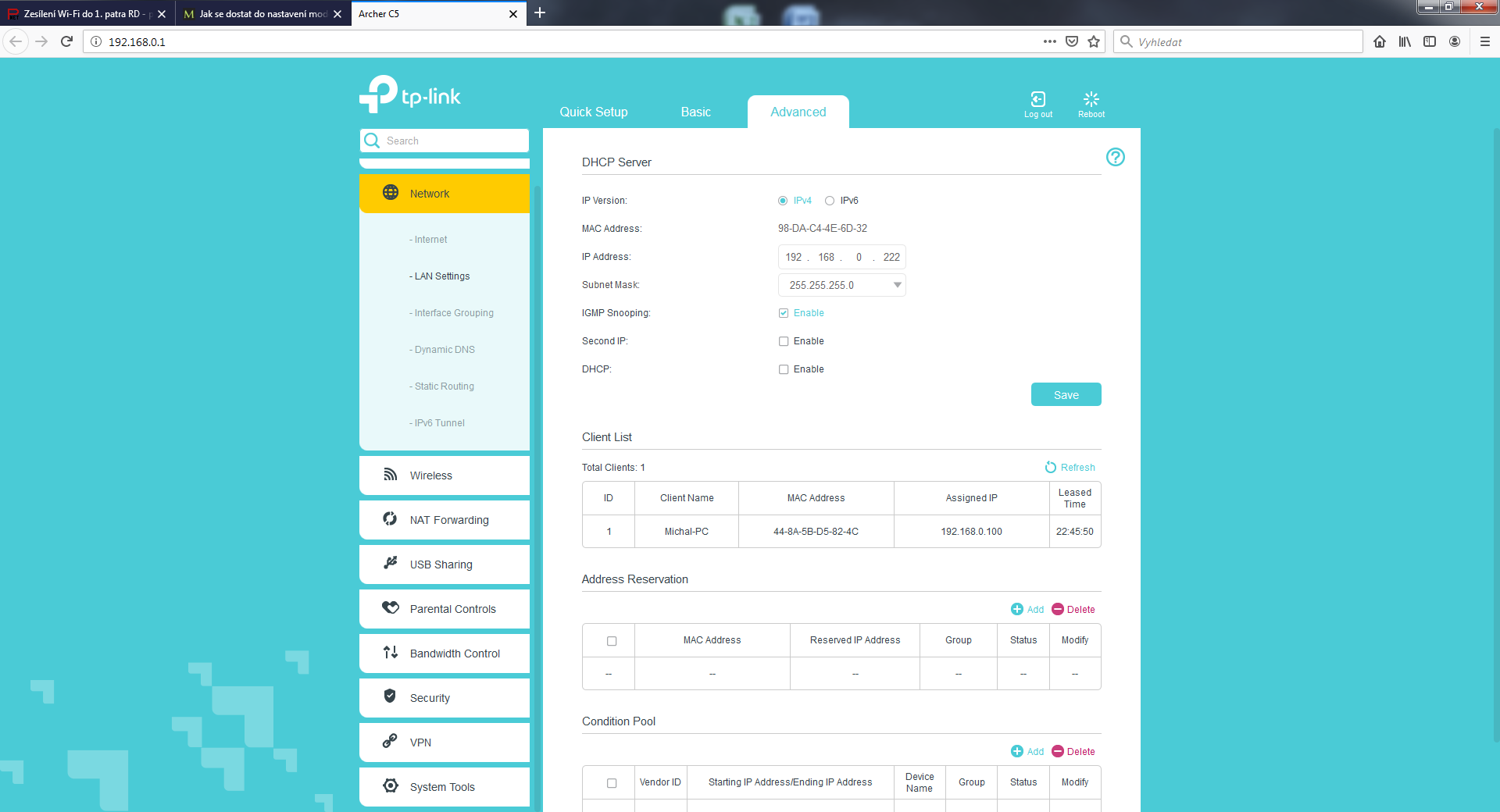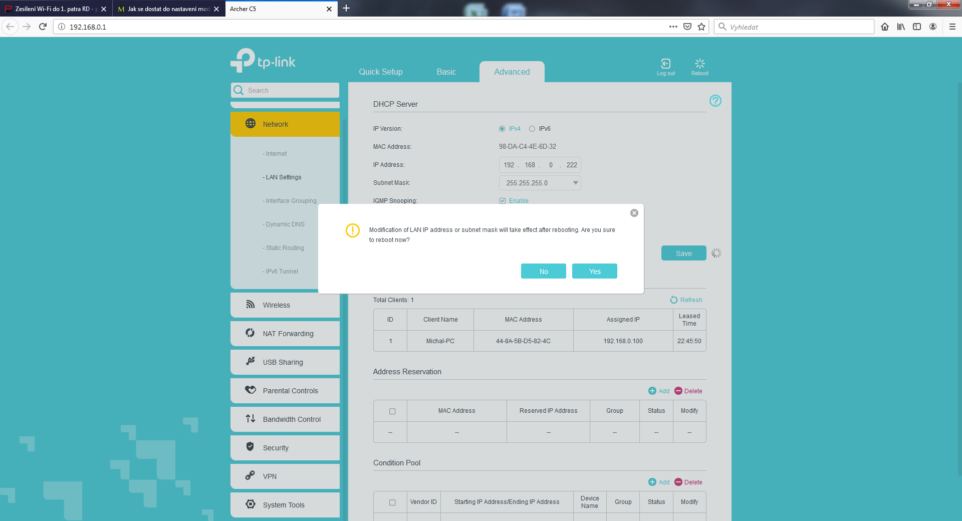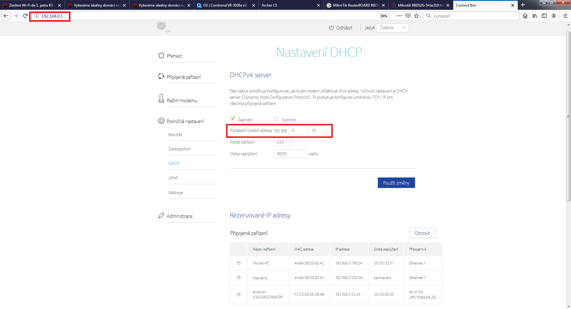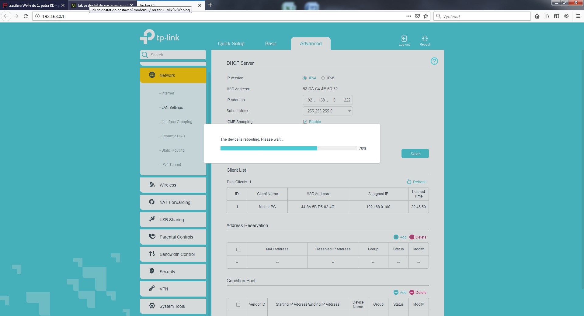 Už mám router doma. Chtěl jsem ho nejdříve vyzkoušet v bytě než ho povezu do RD. Připojil vše jak jsme se domluvili, ale vyskytl se problém. Modem UPC v bytě má IP 192.168.0.1 Brtník psal, ať změním IP adresu routeru. Když jí ale změním už se nemohu přes adresní řádek dostat do administrace routeru, vyskočí jen chybová hláška a pod adresou 192.168.0.1 (192.170.0.1)/(192.168.0.222) nic není. Nejdříve jsem IP změnil na 192.170.0.1, pak na 192.168.0.222. Nakonec jsem nechal původní 192.168.0.1, takže je teď shodná s UPC modemem, který má 192.168.0.1 a já se nemohu dostat do administrace TPlinku. Jelikož mě to pořád připojuje na UPC modem. :/ V příloze jsem dal pár screenu z administrace Tp-linku. DHCP je tedy vypnuté. Prosím co dělám špatně?
