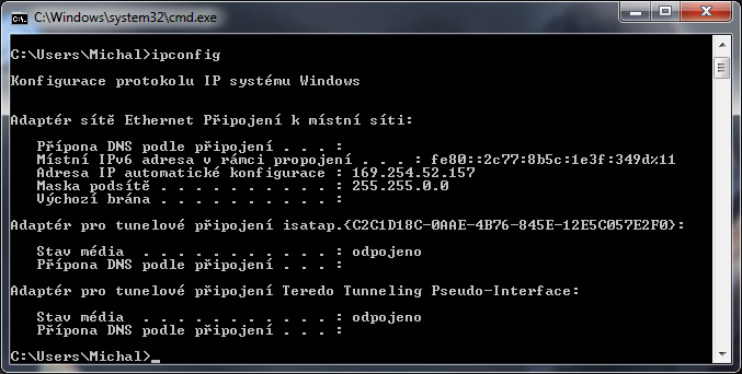 Zkusil jsem to znovu, v přílohách jsou screeny které jsem si myslel, že by se mohli hodit. Netuším kde je problém, stále to nejde. Navíc v ipconfig není brána žádná?? Nenapadá tě kde je problém prosím?