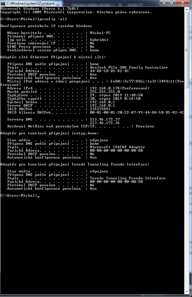 Prosimtě klid. Já nic nechci hned. Jak jsem zmínil toto dělám úplně poprvé tak je možné, že jsem něco popletl. Já jsem vám oběma vděčný, že jste mi s tímhle věnovali čas, nemyslete si že ne. Je to na mě teď hrozně informací naráz, musím si to ještě několikrát přečíst aby až to budu nastavovat tam bylo všechno lepší. Bohužel neznám nikoho kdo by si k tomu se mnou sednul a vysvětloval, ukazoval. Poradna mi zatím ve všem pomohla, sestavila počítač, vyřešila dost problémů. Věřím, že i toto tady dotáhnu do konce. v příloze ipconfig-all