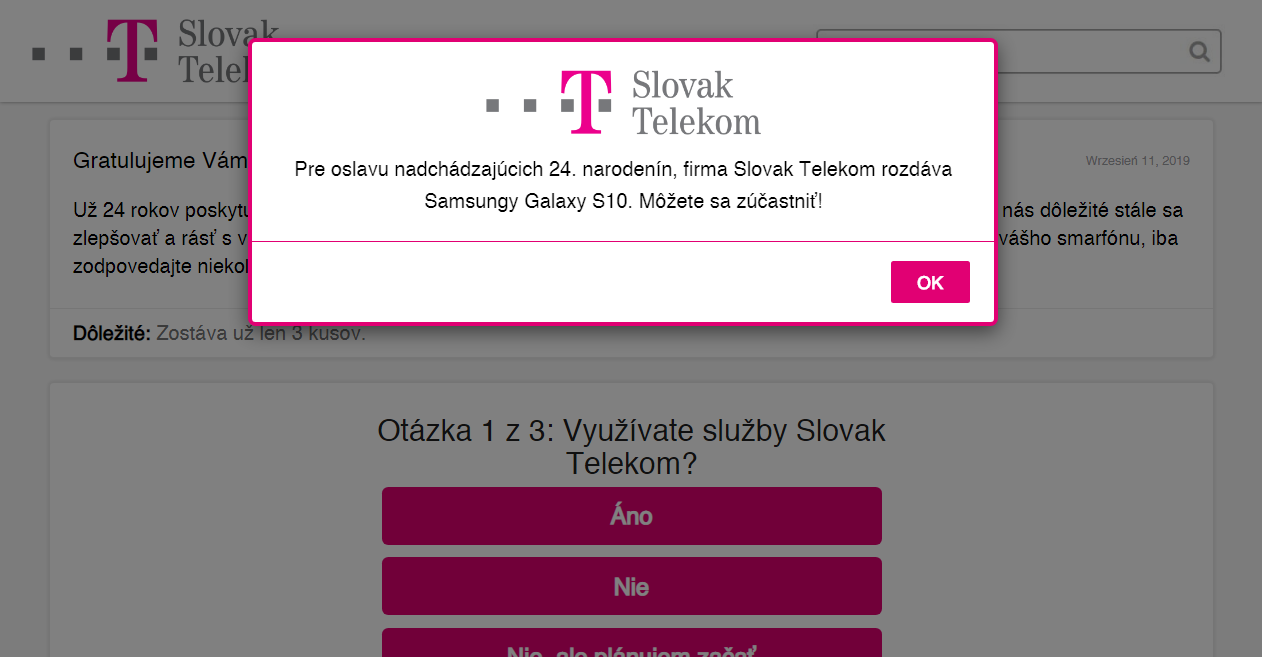 Zdá sa, že ide o pravú anketu, lebo som tú istú dnes dostal od Telekomu pri príležitosti ich veľkého výročia. Dokonca aj odmenu Samsung Galaxy 10 mi ponúkli. Myslíte, že znak Telekom by si niekto dovolil zfalšovať? Obrázok je v prílohe. Zatiaľ som im neposlal nič, ani číslo kreditnej karty, ktoré Telekom žiada. Neviem načo? To mi je podozrivé.