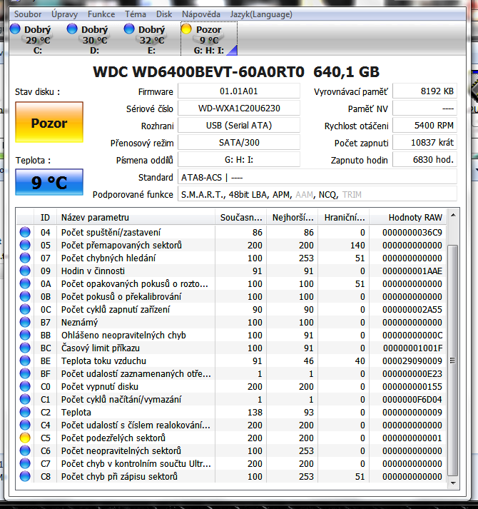 to je zvláštní, disk hlásí 9°c, to je hodně mimo. je pomalý: 5400ot, to se hodí spíš jako usb disk,…