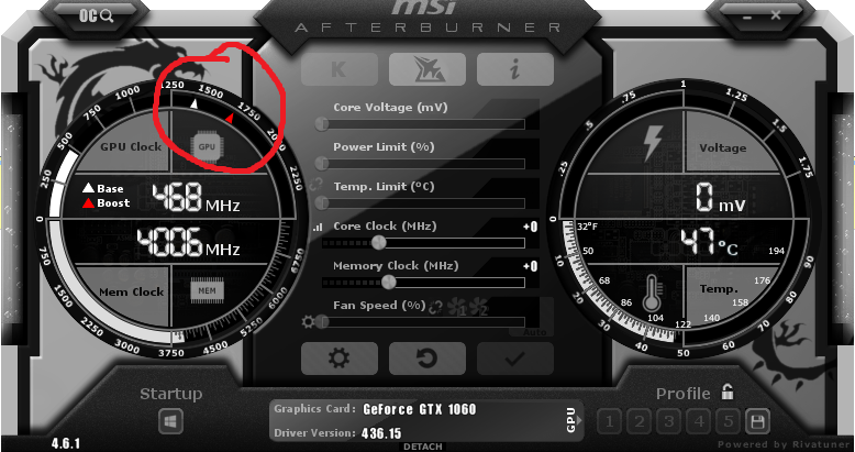 Clock toho GPU je okolo 440MHz pri zaťažení čo je naozaj velmi málo, vedeli by ste mi poradiť že ako vrátiť ten clock do normálu? lebo vidím tam dve šípočky na takom "tachometri" kde biela reprezentuje base clock ktorý sa tam podľa šípky pohybuje okolo 1400 - 1500 MHz ale môj clock je na momentálne na 468. Pridal som aj screenshot toho MSI afterburneru.