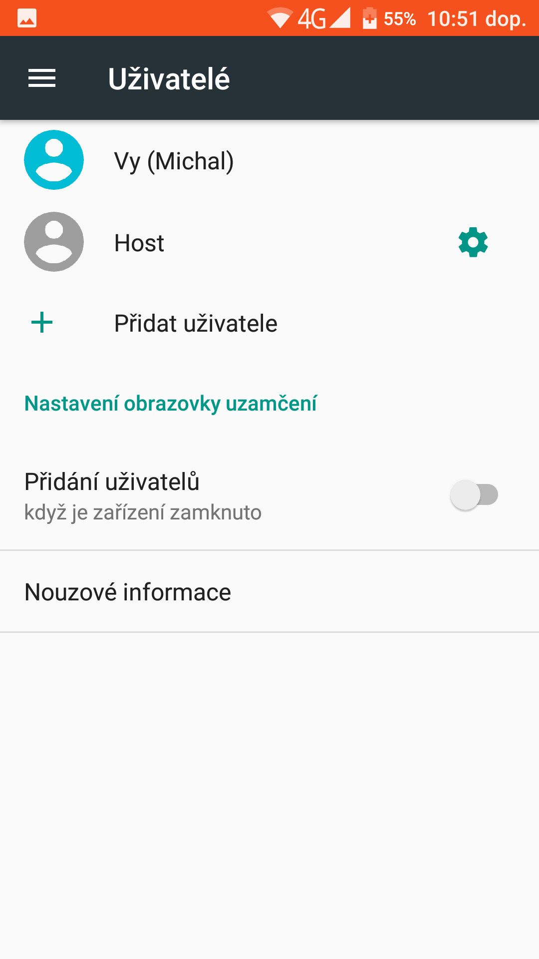 Avšak, když zvolím nastavení -> zařízení -> uživatelé, tak tam host stále je - obrázek. Nelze s ním nic dělat, pouze mu zapnout telefoní hovory.