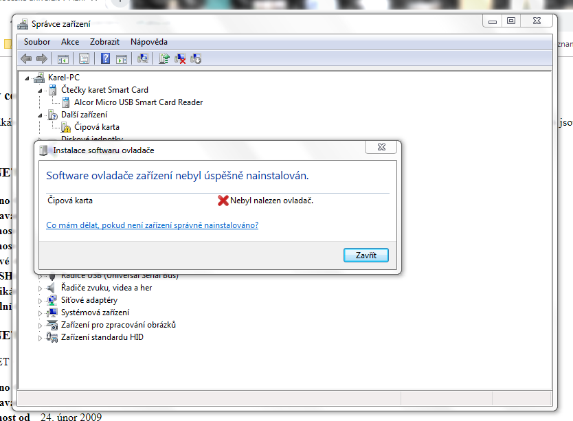 Dobrý den. Jak je už z nadpisu a obrázku patrno, mám tento problém. Kliknu-li na čipovou kartu a ani jeden z odkazů ovladač nenajde. Děkuji za odpověď.