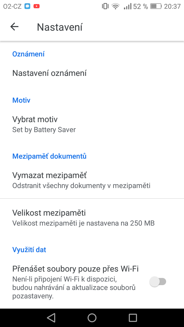Ahoj, měl bych prosím dotaz ohledně Disku Google na mobilu P8 Lite, Android 6. Když chci pracovat s informacemi na Disku Google v mobilu, tak jedinou možností, jak s ním pracovat, je při připojení na Wi-Fi. Když zapnu data, tak se mi informace na disku vůbec nenačtou. I když mám data zapnutá, data nemám vyčerpaná (internet mi normálně funguje), synchronizaci mám zapnutou, stále Disk nefunguje. Jde zkrátka pouze na Wi-Fi. Nevíte někdo? Díky!