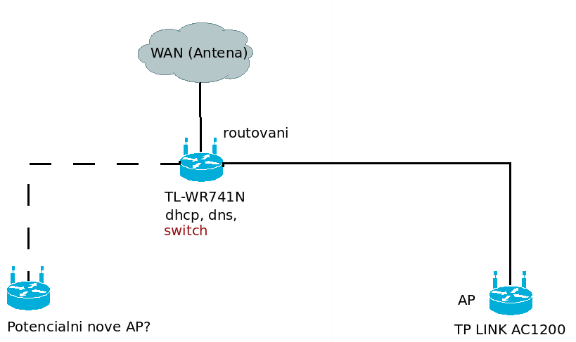 Za ten centrální router ho nicméně připojit můžeš, případně si dokup druhé AP, abys měl dvě wifi paralelně (viz příloha). Nezapojuj je ale do WAN portu ale do jednoho z těch LAN. Ono by to sice fungovat mohlo, ale také by sis mohl přinést problémy s konflikty adres, další zbytečné podsíťování a NATování, o což nestojíž. WAN port zapoj do routeru za antenou, vše ostatní vždy do LAN portu.