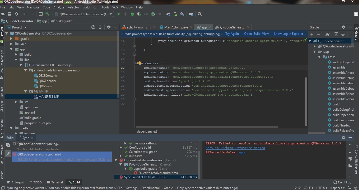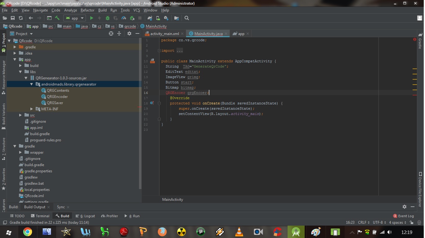 Já jsem ten projekt udělal znovu podle video návodu https://www.youtube.com/watch?v=UKXPXT7i2Kc přidal tu knihovnu podle tohoto návodu https://www.youtube.com/watch?v=CiuqMu5UHMQ a ty knihovny mám od https://repo.spring.io/libs-release/androidmads/library/qrgenearator/QRGenearator/1.0.3/ ale bez toho řádku to asi nepůjde protože jak jsou v té knihovně 3 třídy jedna s těch tříd je QRGContents kde si dělám chybu nevím kde