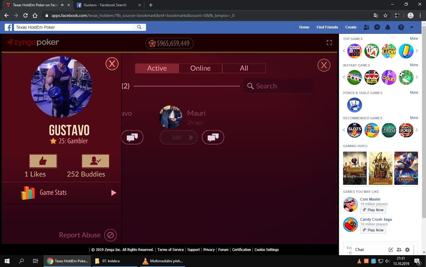 Dobrý den, snažím se najít jeden Facebookový profil kámoše, kterýho mám v přátelích v Zynga Pokeru (poker buddies), ale na Facebooku v přátelích ne. Snažím se ho najít, ale neznám jeho celé jméno. Když si zadám Gustavo do vyhledávače, najde mi to mnoho lidí s tímto jménem a tohohle Gustava vůbec nemůžu najít. Jak se dá najít? Já jsem se ho už ptal přes zprávu v Zynga Pokeru, jaké je jeho celé jméno, ale teď není nějak dostupný. Zkoušel jsem vystřihnout jeho fotografii a najít jeho profil za pomocí fotky v Googlu vyhledávání obrázků s vírou, že se mi zobrazí odkaz na jeho FB profil a nic. V příloze je screen a jeho vystřižená fotografie. Pokud by mi ho někdo našel a dal mi sem odkaz, byl by zlatý. Je to fajn týpek, dobře jsme si popovídali u pokeru, v angličtině.
